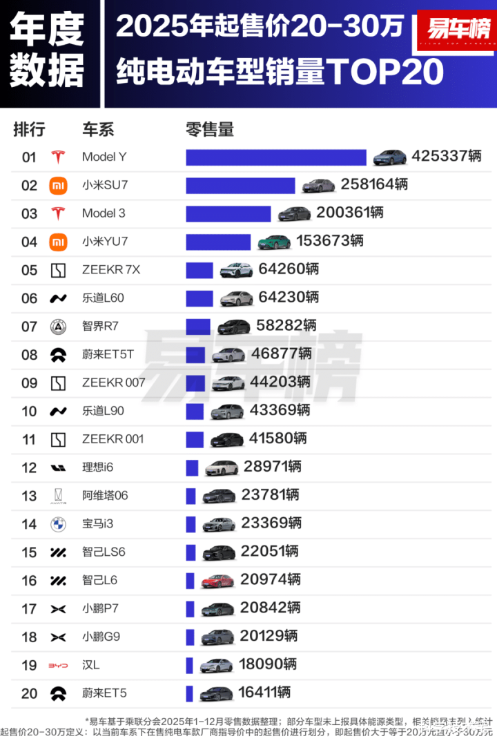 去年20万元到30万元最畅销的20款纯电车型分别为特斯拉Model Y、小米SU7、特斯拉Model 3、小米YU7、极氪7X、乐道L60、智界R7、蔚来ET5T、极氪007、乐道L90、极氪001、理想i6、阿维塔06、宝马i3、智己LS6、智己L6、小鹏P7、小鹏G9、汉L、蔚来ET5。